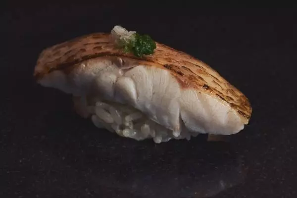 脂がのったふわふわののどぐろは、対馬で釣りあげられる最高級ブランド「赤瞳」。シャリに採用するのは、「幻の米」と称される岐阜県のブランド米「美濃ハツシモ」。大粒で噛み応えがあり、ネタの旨みを引き立てる