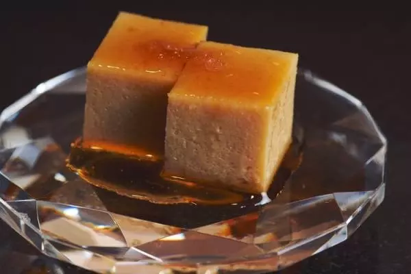 玉子はガラスの器とともに登場。かかっているのはマルドンの塩とアガベシロップ