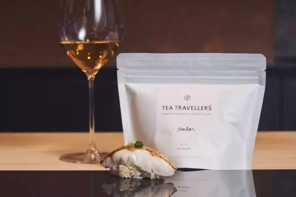 のどぐろ×ティートラベラーズの「アンバー」。ソーダでアップすることで、アルコールが苦手な人でもスパークリングワインのように愉しめる