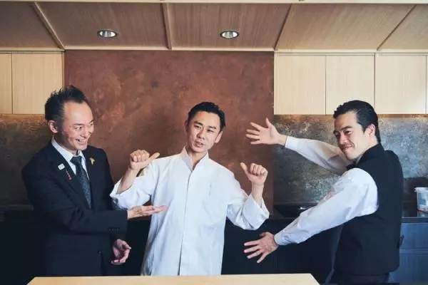 左からソムリエの岡地伸幸さん、店主の阿重田博紀さん、ソムリエの根岸洋介さん。とにかく明るく、サービス精神が旺盛だ