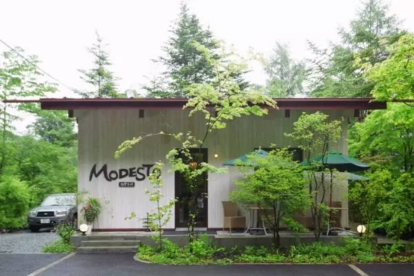 中軽井沢駅から徒歩12分、大通りから少し入った静かな森の中にあるのが【MODESTO】。