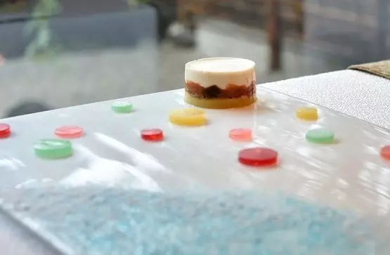 『フォアグラのテリーヌとラタトゥイユ新生姜のムースに4色のドットゼリー』