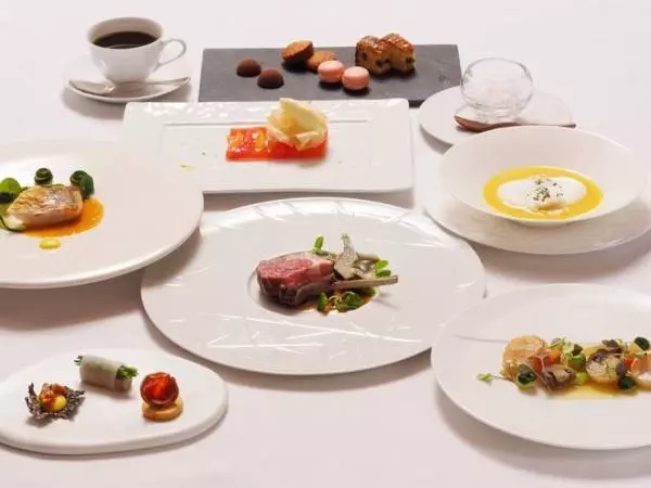 メニューはコースのみ、新鮮で珍しい野菜が魅了するメニューの数々は特別な時間を演出してくれます。少々ハードルが高く感じるフレンチもランチコース『D’ejeuner AUBE』なら気軽に楽しめます。アミューズ、お料理4品、デザート2品、どれも目で見て楽しむことができる美しいフレンチ。