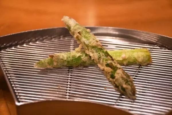 天ぷらの最後を飾るのが『アスパラのてんぷら』です。澄んだ緑色をしたアスパラガスは。口に入れるとジューシーな舌ざわりとともに甘みがぐーーっと口の中で広がります。
