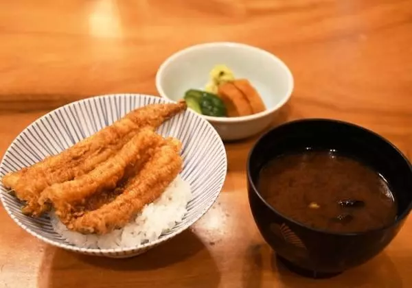 穴子の身はふわっふわで濃い口の天つゆとベストマッチです。たんぱくな味の中から穴子の脂の旨みが伝わって、どんどん白米を口にかき込んでしまいます。