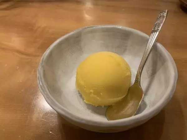 今日食べた、天ぷらを思い返しながら、上品な甘さのマンゴーシャーベットをいただきました。