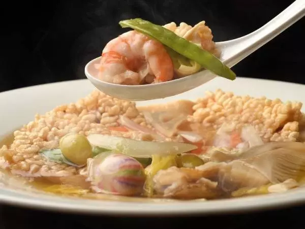 国産のもち米を高温で揚げてつくったサクサクの食感と香ばしさ漂うおこげに、黄金色のスープからつくる熱々の餡をジュッとかけていただきます。京都の旬の食材も入った、見た目も美しい洗練された一品です。また、京都タワーオリジナルメニュー『かわポン』もオススメ。プリッとした鶏皮の食感と肉汁が病みつきになります。