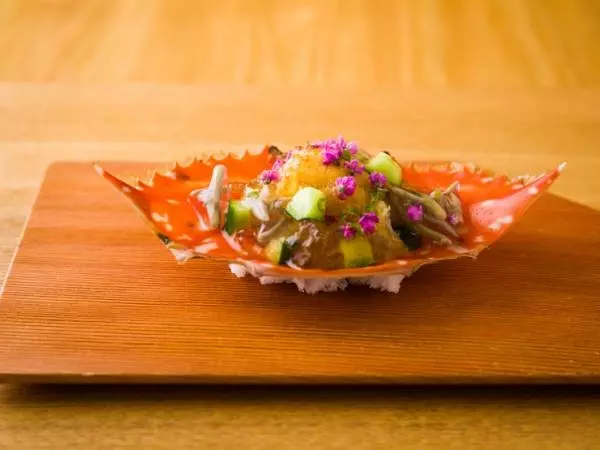 お店は完全予約制で、料理は月替わりのおまかせコースのみ。コースの最初に出す先付けは、季節に応じて寒い日は温かいものを選ぶなど、ゲストへの心遣いも忘れません。カニの甲羅を器に見立てた先付『菱蟹とウニとジュンサイの土佐酢のジュレがけ』は、色彩豊かで魅了されます。上質な空間で特別な記念日を過ごしてみてはいかがでしょうか。