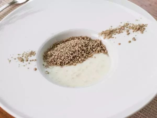 『冷製・じゃがいも・キタアカリのポタージュ夏トリュフのグラス・パウダー』はランチコースでも味わえる一皿