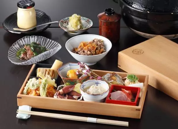 豊富な種類の料理を楽しめる、ランチに人気のお弁当『季節の木箱弁当織部』5,000円(税抜)