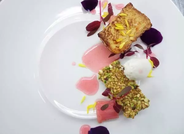 ピスタチオやルバーブの彩りが鮮やかなブリオッシュのフレンチトースト『フォアグラピスタチオルバーブパンペルデュ』