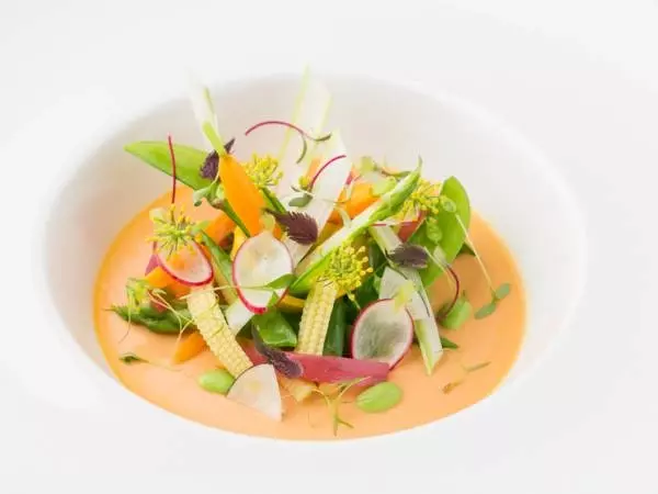【ピエール・ガニェール】では、すべての料理において、季節ごとに異なる旬の食材を使い、気候や気温を意識しながらメニューを考案しています。パッションフルーツとヘーゼルナッツオイルドレッシングで味付けしたサラダに、にんじんのフランとライムのジュレを合わせた『季節の野菜』は、野菜の生命力を強く感じられるフレッシュな一品。