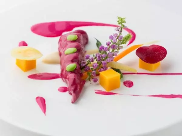 コース料理では全体の流れも重要です。味や香り、食感などにメリハリをつけながら、全体を通して一品一品が調和するように料理が組み立てられています。『オマールブルーのショーフロア仕立て』は、最高級食材のオマールブルーを贅沢に使った一品。お皿をキャンバスに見立てながら、「奇跡の野菜」と呼ばれる赤ビーツのソースで、大胆かつ繊細に描きます。
