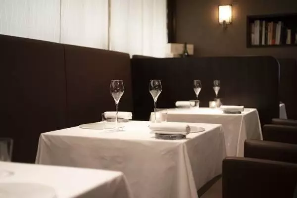 ビルの4階にある【ALLIE】。白いクロスがダークブラウンを基調としたダイニングに映えます
