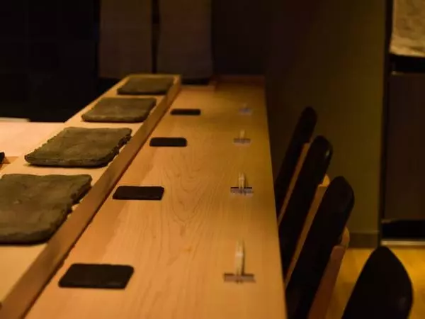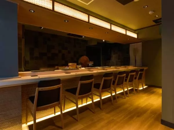 大人の雰囲気が漂うシンプルで落ち着いた空間には、カウンターが6席。柔らかな光と、和モダンなインテリアが上質感を加えてくれます。カウンター越しに、ベストなタイミングで鮨が渡されるので、会話がより一層弾みます。ゆったりとした気分で熟成鮨を堪能して。