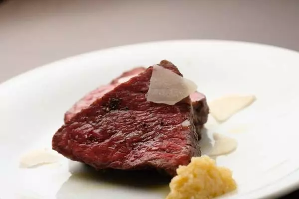 こちらは、『本日の厳選和牛の炭火焼』。シェフこだわりの炭火による火入れで、熟成された肉の旨みが最大限に引き出されます。焼き上がりまで少し時間はかかりますが、待つ価値のある逸品。炭火焼はこのほかに、『兵庫県産豚ロース炭火焼』『ハンガリー産自家燻製鴨の炭火焼』『タスマニア産仔羊の炭火焼』も用意されています。