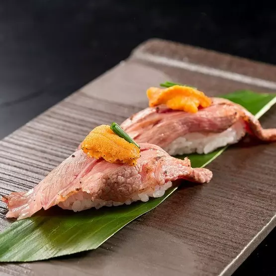 シャンパンやワインにも合う『黒毛和牛ロース炙りと雲丹のにぎり寿司』1,100円