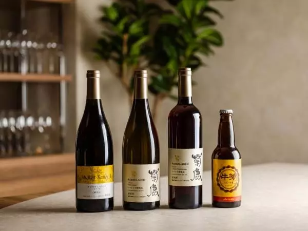 <左から順に>熊本ワイン「マスカットベーリーA 樽熟成2018」、「菊鹿カベルネ 樽熟成2020」、「菊鹿シャルドネ 樽熟成2021」、JA「ごぼうのお酒バードックエール」