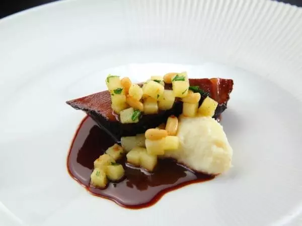 添えられているのは紅玉リンゴと松の実、根セロリのピューレ。タンはやわらかくて、噛むほどに広がる濃厚な味わいが癖になります。