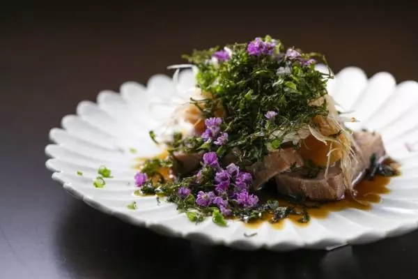 例えばこちらの『お造り』は塩釜の天然本マグロを藁で燻製にし、唐津の手摘み海苔、花穂紫蘇を添え、割り醤油と合わせたもの。藁の香ばしさと海苔の風味がマグロの旨みを引き立てます。