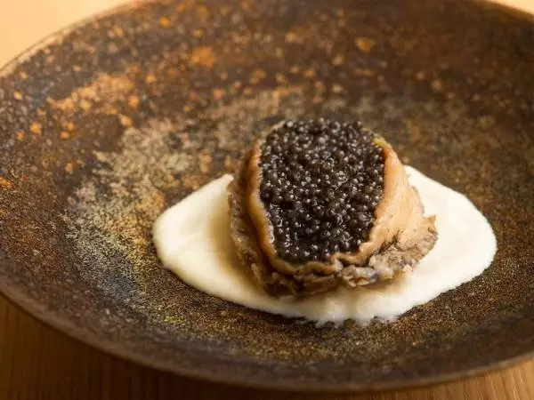 『鮑の酒蒸しにキャビアを敷き詰めて』(コースの一例)日本酒で蒸した鮑をキャビアと一緒に贅沢にいただく
