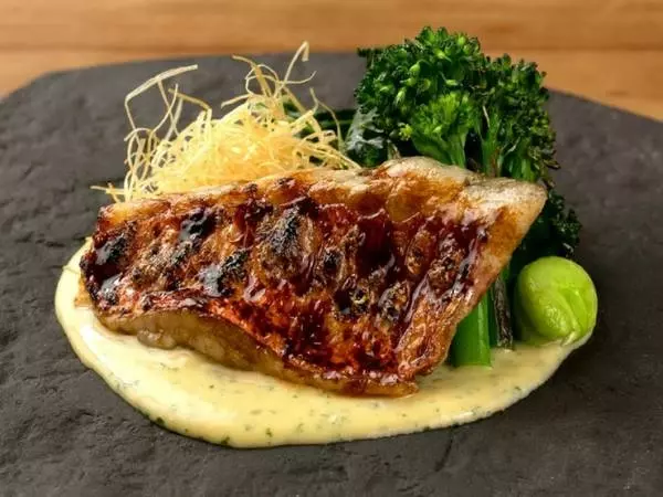 『金目鯛炭火焼き木の芽味噌』(コースの一例)炭火で焼いた金目鯛が美しく盛り付けられている