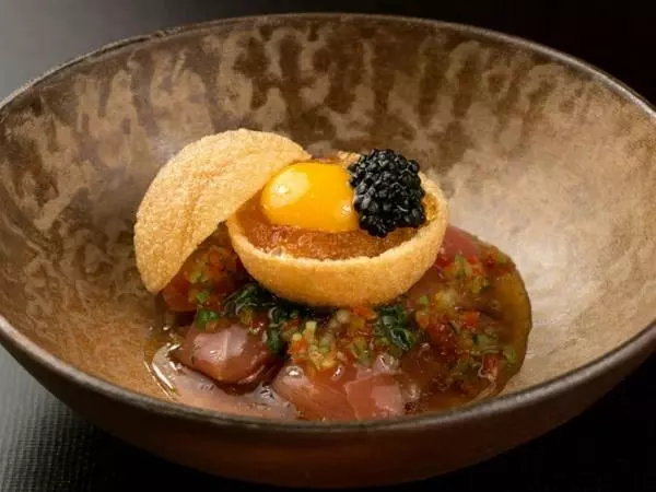 【炭火割烹 白坂】の定番料理の『鮪とウニの冷製』。鮪とウニに、だしゼリーやクラッカーなどが見た目も美しく盛り付けられた一皿です。混ぜながらいただくことで、それぞれ食感の違いや、絶妙な味わいを堪能できます。