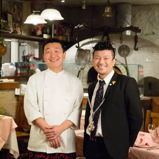 1994年の開店当初より3代のイタリア人シェフのもとで修業を積み、その後20年以上にわたり【IL BUTTERO】の味を守り続ける。繊細かつ力強いトスカーナの本場の味を常に追求しながら、革新的で完成度の高い料理へと昇華させる。右はソムリエの小嶋誠也さん。