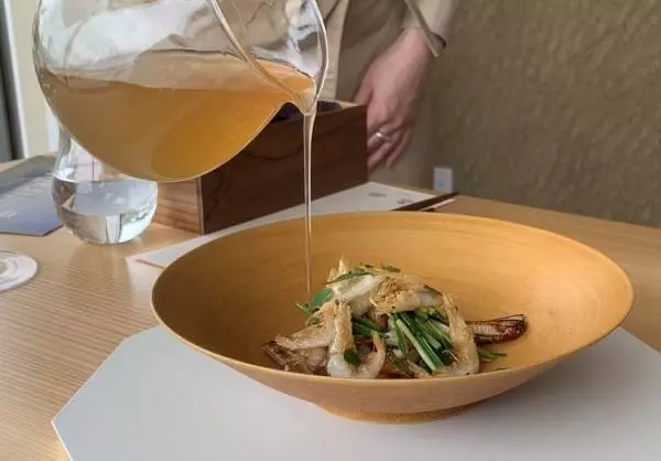 白エビの皿が運ばれてきました。ここで獲れた米や山菜、タケノコなどのが入っていて、テーブルで出汁がかけられます。エビ茶漬けといった感じなのですが、香りがとても華やかで、かつおと昆布の出汁に沖縄の月桃というハーブの香りを移しているとか。お酒で火照り始めた体にじんわりと染み入るような感じです。