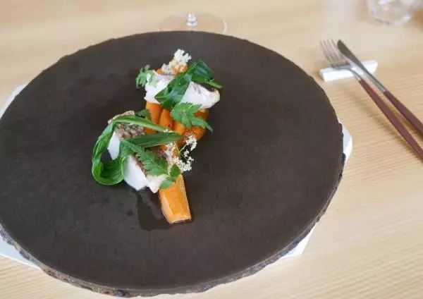 カトラリーこそポルトガルの有名なクチポール社製ですが、皿は地元の作家の手になるものが中心で、その下に敷かれる白い重いプレートはコンクリートで作ったとか。