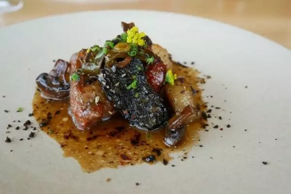 ポークは黒部名水ポークと呼ばれるもので、しっかり火が入っていますが、身は柔らかくしっかりとしたうま味があって、バーデンのこの赤ワインによく合います。モリーユやフェンネルがつけ合わされ、黒オリーブのパウダーが風味を添えています。