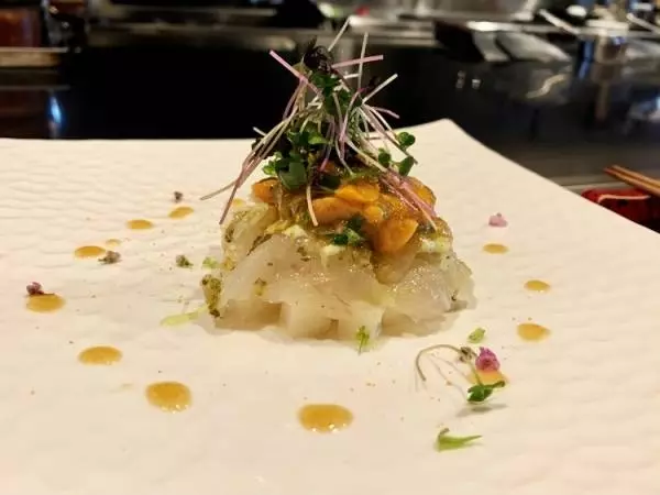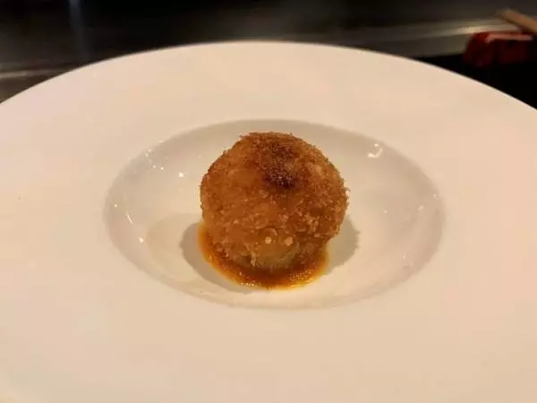 コースの始まりは、魚介の旨みがふんわり広がりホクホクの幸せを感じる『シーフードのコロッケ』から。3日前に活〆にしたという『コチのカルパッチョ』は見た目から繊細で美しく、身が分厚くてぷりっぷりの食感をゆっくりと味わいます。ウニを使用したドレッシングはクリーミーで、コチとの相性も抜群。下に隠れている大根とナガイモの食感も楽しく、サッパリとした味わいはずっと食べ続けたくなってしまいます。