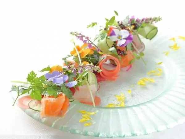 京都・園部の契約農家から仕入れる朝採り地場野菜を中心に、四季折々の旬の食材でつくられる極上のフレンチが堪能できます。なかでも、まるでお花畑のような可愛いアレンジの『鮮魚のカルパッチョ庭園仕立て』は、女性に人気の前菜。美しい盛り付けに、次の料理への期待が膨らみ、会話も弾みます。