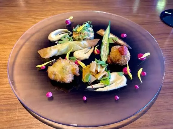 前菜は「シラス・ズッキーニ・ジャガイモの春巻き」や「オクラの素揚げ」、「ヤングコーンのソテー」など、季節の野菜が勢ぞろい。パッと目につくピンク色のソースはビーツとギリシャのチーズを合わせたもので、さわやかな酸味とチーズのこっくりとした味わいが野菜の旨みを引き立ててくれます。
