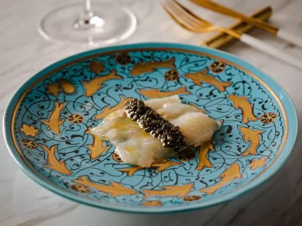 『チョウザメのカルパッチョ』。カトラリーもオーダーした特注品