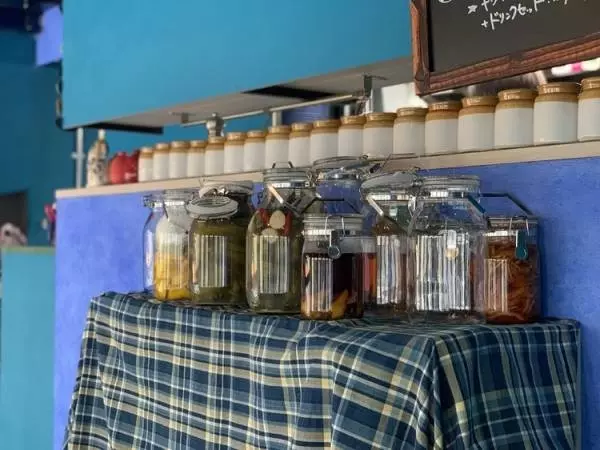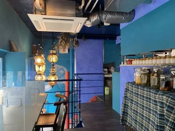 モロッコのシャウエンを思わせるような青が素敵な店内は、入り口を境にカウンター席とキッチンがある中2階、テーブル席がメインの半地下に分かれていて、空席があれば好きなほうに座ることができます。