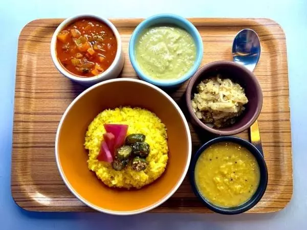 表参道でのメニューは、決まったカレープレートに付け合わせを2種類選ぶかたちでしたが、代官山ではまず『野菜カレーと豆カレーセット』と『チキンカレーと豆カレーセット』からカレーを選び、付け合わせはオプションとして5種類から好きなだけ選べるようになりました。