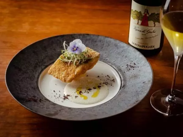 『白身魚のコトレッタ』にすすめてくれたワインは、シチリアの土着ブドウ品種でつくられたミネラル豊富なドンナ・フガータの『アンシリア』。味わいの説明だけでなく、ときにラベルに描かれた絵のモチーフなど印象に残る物語を教えてくれたりもします