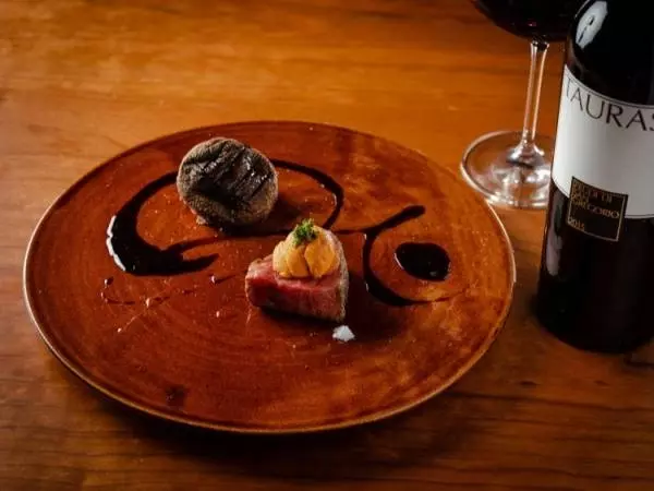 イチボのしっとりとした口あたり、脂の旨みと肉厚の原木椎茸の香りと旨みが相乗。そこに合わせるワインは、ジューシーで奥ゆきのある果実味、ほどよく熟成感も味わえる南イタリア・カンパーニア州を代表する『タウラージ』