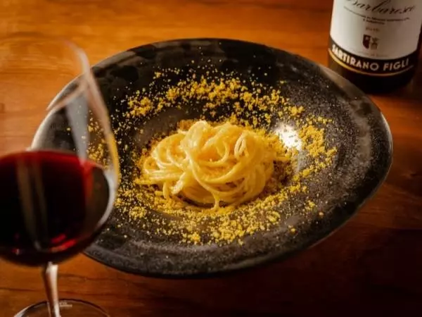 カラスミのパスタに合わせるのは、「白で合わせるのが王道ですが、エレガントな香り、若飲みできるバ2016年のバローロで贅沢な雰囲気を盛り上げるのもいいのでは?」と溝尾氏。ゲストの好みに合わせてときに変化球の提案で楽しませてくれます