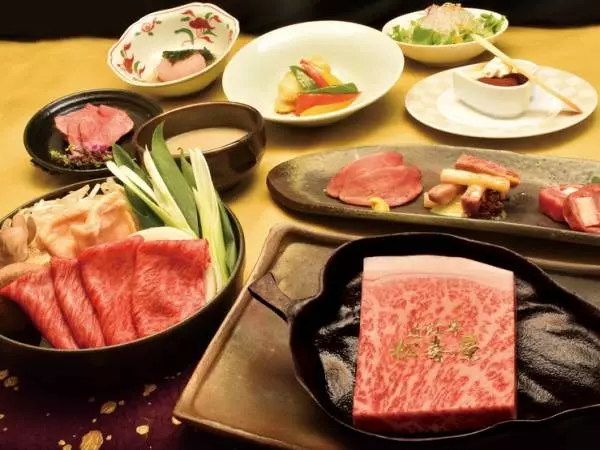 2階、3階のみでいただける人気のコース『鶴-Tsuru-』。先付から始まり、八寸、季節の料理2品、スープ、サラダ、そしてメインは近江牛極上サーロインステーキと、極上すき焼きを。これに飯物、デザート、珈琲or紅茶がついたボリューム満点のコースは、近江牛の魅力をじっくりと堪能できるでしょう。
