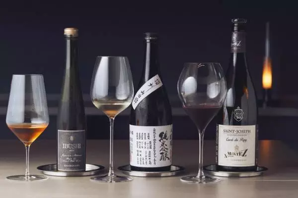 蝦夷鹿に合わせてセレクトされたワイン、日本酒、日本茶。このほか、ぶどうジュースとコンブチャを割ったジュースも用意されています