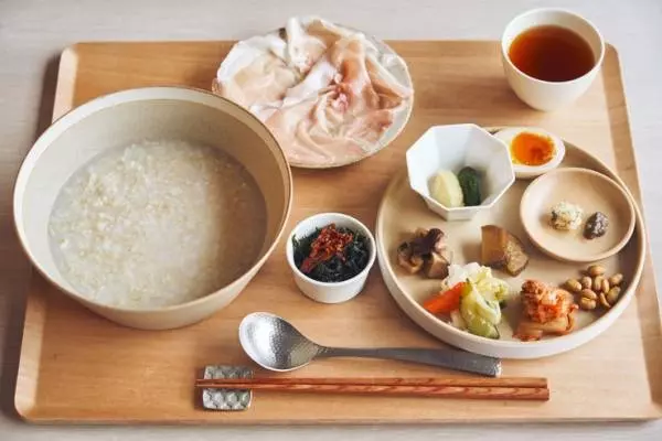 9時からいただけるモーニング『あなたの健康を守る朝粥』は、玄米粥に極薄生ハム、全国から集めた10種の副菜がセットになった「朝粥」です。
