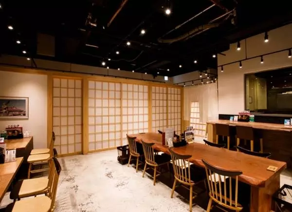 障子を思わせるエントランスが印象的な、広々とした店内
