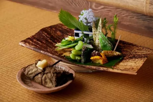 「旬の味だけでなく、まずはその季節の色を感じてほしいですね」と大将。そこには、朝早くから京都の奥、美山の里山に自ら行って摘んできたという小紫陽花が可憐に咲き、淡いものから濃いものまで様々な緑の食材が添えられ、初夏ならではの里山の風景が目に浮かんできます。これらのほとんどの食材を自ら山で採ったり、畑に足を運んで直接買い付けているというから驚きです。そこには“走り回って食材を集める”という馳走本来の姿があります。