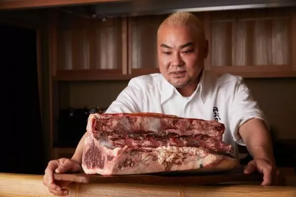 ドライエイジングビーフを極める滋賀県・草津の精肉店【サカエヤ】から仕入れる十勝若牛。この牛肉をレストランなどに卸しているのはこの店のみだとか。骨付きの巨大なまま仕入れるので、厨房にも大きな熟成庫があります