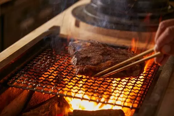 備長炭で焼く、十勝若牛のサーロイン。香ばしい香りがたまりません