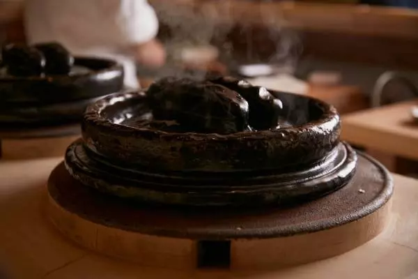 メインの肉料理の後は、締めへと続くごはんが。【草喰 なかひがし】では、おくどさんで炊く土鍋の白いごはんこそがメインディッシュと言うように、【月おか】にもまたその精神が受け継がれています。