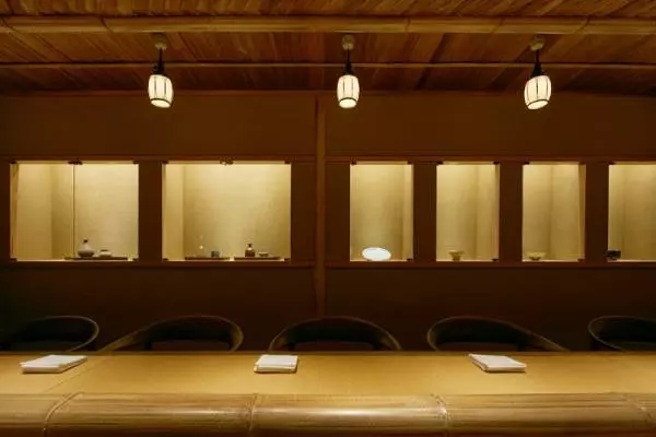 カウンターの後ろにはまるで美術館の様に古美術が展示されています。使用する器も桃山時代の赤織部から江戸時代の染付、現代作家のものまで「中国や朝鮮から渡ってきた器も、欠けようが割れようが、継いで使ってきた。これこそが日本で培われてきた文化。日本料理と共に日本文化を楽しんでほしいです」と月岡さん