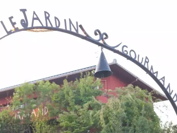 古江駅の北の山手に広がる閑静な住宅街の中腹に鎮座する一軒家フレンチレストラン【ル・ジャルダングルマン】。駅からなだらかな坂道を歩くこと数分、突然広々とした果樹園が広がり、その向こうにヨーロッパのシャレーかと見まがう赤茶色の壁に店名が大きく書かれた一軒家が現れます。ゲートから入り口まで続く坂道に自家菜園の野菜やハーブが。この演出に料理への期待が自然と高まります。